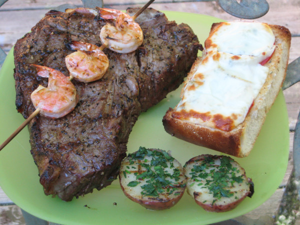 Dinner was an absolutely awesome 2” thick, over 2 pound T-Bone Steak, a skewer of “large” grilled shrimp, grilled potatoes with butter, fresh chives and parsley, and a piece of tomato bread. And no, I didn’t eat all of the steak, but it will make a couple of fine steak sandwiches for lunch this week.