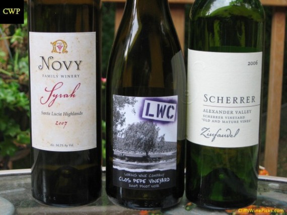 My wife had some nice bottles this week while I was traveling.  These are all 375ml half bottles that were on the counter to greet me when I got home.  The wines were a 2007 Novy Santa Lucia Highlands Syrah, 2009 Loring Clos Pepe Pinot Noir, and a 2006 Scherrer Alexander Valley Old and Mature Vines Zinfandel.