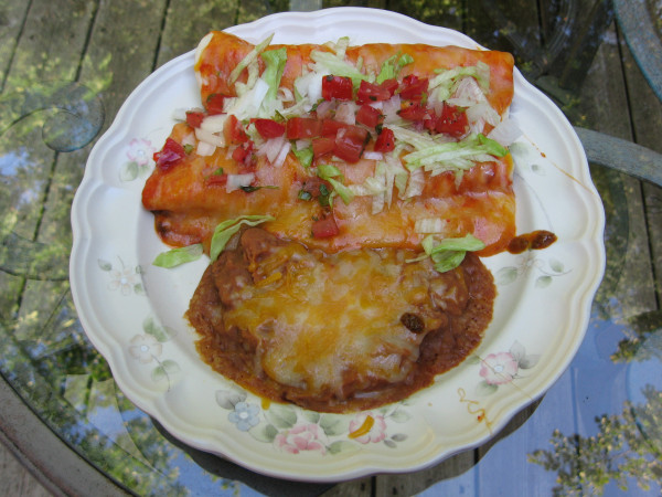Here was our Saturday dinner.  We had beef burritos with enchilada sauce, cheddar jack cheese, fresh lettuce, onions, and my wife’s fresh salsa.  A side of spicy refried beans with some cheese finished off the meal.  The Prisoner ended up being a pretty good pairing with the meal.